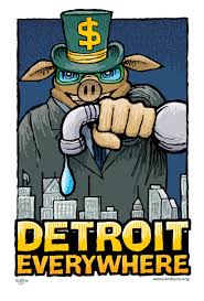 Visiting Detroit is the closest Americans can come to viewing ( perhaps future conditions around the nation) what appears to be a war-torn city without leaving the U.S. This former powerhouse is a barren stretch of land, devastated by looters and and full of run-down, vacant houses. Rows upon rows of dilapidated structures line the streets; empty apartment buildings and factories consume the landscape. Almost a third of Detroit has been abandoned.(2)>>African- Americans are by far the largest racial or ethnic population in Detroit, which has the highest percentage of black residents of any American city with a population over 100,000. Eighty-three percent of the city’s 701,000 residents are black. It continues to be an underreported story that a white state legislature and white governor took over the city and forced it to file for bankruptcy against the will of its elected representatives. It is also underreported that white governors and the white state legislature failed to provide Detroit with its fair share of state tax revenues – a significant contributor to the city’s current financial distress.It’s important to view what is happening to Detroit and its public employees through a racial lens. The fact that nearly 1.5 million whites left Detroit over the last half century as its African American population grew is the single biggest reason for its current distress. As the wealthier white population left Detroit, the overall population shrank and the city’s tax base shrank, too, leaving Detroit less able to support public schools, public safety, and its huge, geographically spread-out infrastructure. Corrupt mayors or antagonistic mayors are a sideshow compared to the gigantic outmigration of whites that began in the 1950’s and turned Detroit from a wealthy white city into a desperately poor black city.